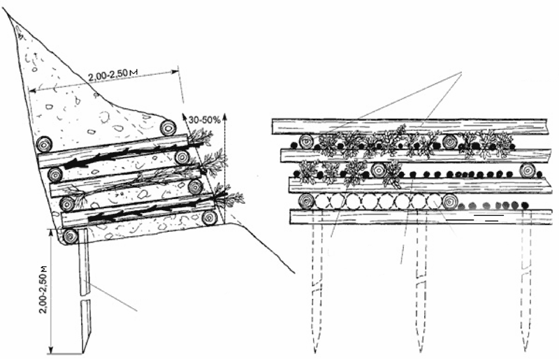 7. «Опорные» стены – бревенчатые, каменные с озеленением, комбинированные. Один из вариантов это озелененная опорная стена, которая создается для укрепления основания склона и промоин на склонах. Она также может служить для укрепления берегов. Опорные стены (рис. 28) – это деревянные сооружения с одинарными или двойными стенками из бревен. Каждый ряд заполняется имеющимся в наличии материалом, на переувлажненных склонах – дренажным материалом. Опорную стену строят под углом, ее ширина 2–2,5 м. На каждый бревенчатый слой стены укладывают ветви древесных пород (например, ивы) и саженцы лиственных пород, способных по всей длине ствола давать корни. Растения должны быть примерно такой же длины как опорная стена, и укладываются таким образом, чтобы они выходили за пределы сооружений не больше, чем на 20 см. Работы производятся в период вегетационного покоя.