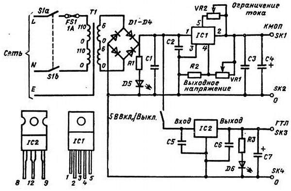 Нерегулируемое постоянное напряжение, действующее на конденсаторе С1, подается на входы регулируемого стабилизатора IС1, а через тумблер S2 — на Г-образный стабилизатор IC2. Выходное напряжение IC1 регулируется с помощью переменного резистора VR1, а ограничение тока устанавливается резистором VR2. Светодиод D6 показывает наличие напряжения на ТТЛ-выходе.