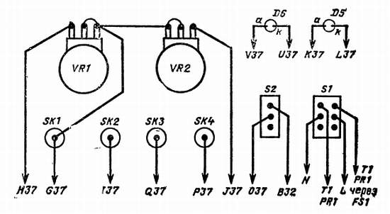 Дополнительные детали: Т1 — силовой трансформатор, 20 или 24 В·А, с первичной обмоткой на 240 В (или двумя обмотками на 120 В, включенными последовательно) и вторичной обмоткой на 12 В (или две на 6 В) и ток 1,6 или 2 A; FS1 — быстроплавкий предохранитель на 1 А длиной 20 мм и держатель для него; S1 — миниатюрный двухполюсный поворотный выключатель на два положения, рассчитанный на 240 В; S2 — миниатюрный однополюсный поворотный переключатель на два положения; SK1—SK4 — гнезда диаметром 4 мм (два черных, одно красное и одно зеленое).