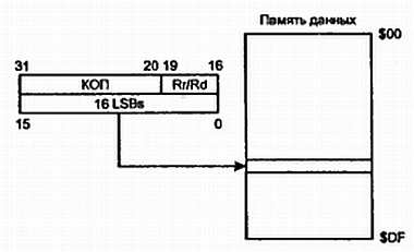 16-разрядный адрес ячейки памяти данных находится в коде команды, состоящей из двух слов. Rr/Rd определяет регистр, используемый при работе с памятью данных (т. е. регистр, куда записываются результаты операции либо откуда они берутся для выполнения операции).