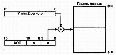 Адрес операнда определяется как сумма содержимого Z или Y регистра и бит 0…5 кода команды.