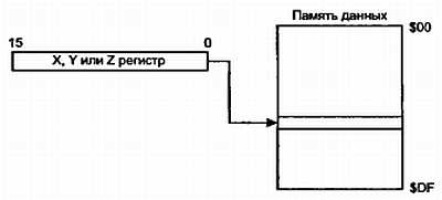 Рис. 2.11. Косвенная адресация к памяти данных Адрес операнда находится в Х-, Y- или Z-регистре.