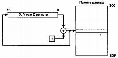 Адрес операнда находится в Х-, Y- или Z-регистре. Однако перед выполнением операции соответствующий индексный регистр Х-, Y- или Z уменьшается на единицу.