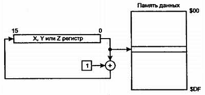 Адрес операнда находится в Х-, Y- или Z-регистре. После выполнения операции соответствующий индексный регистр Х-, Y- или Z увеличивается на единицу.