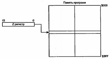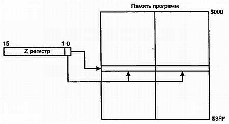 Адрес константы — байта содержится в регистре Z. 15 старших битов определяют адрес слова, а младший (0) бит — младший или старший байт константы в памяти программ. Если в младшем бите
