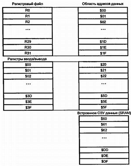 Каждому регистру присвоен адрес в пространстве данных, они отображаются на первые 32 ячейки ОЗУ. Хотя регистровый файл физически размещен вне ОЗУ, подобная организация памяти дает гибкий доступ к регистрам.