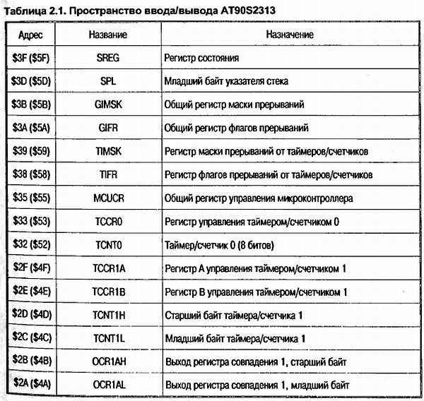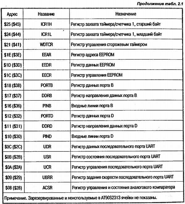 Все устройства ввода/вывода и периферийные устройства AT90S2313 располагаются в пространстве ввода/вывода. Различные ячейки этого пространства доступны через команды IN и OUT, пересылающие данные между одним из 32 регистров общего назначения и пространством ввода/вывода. К регистрам $00…$1F можно осуществлять побитовый доступ командами SBI и CBI. Значение отдельного бита этих регистров можно проверить командами SBIC и SBIS. Дополнительную информацию по этому вопросу можно найти в описании системы команд.