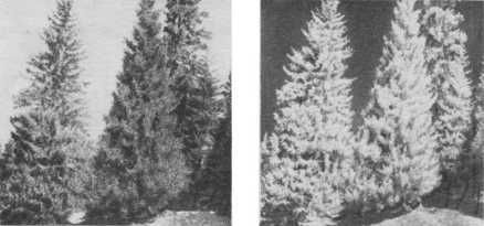 Но вскоре наступило разочарование. Земные растения обладают одним любопытным свойством — они очень сильно отражают невидимые тепловые, так называемые инфракрасные лучи. Обнаружить это можно очень просто. Сфотографируем какое-нибудь земное растение, ну, скажем, елку, через светофильтр, пропускающий инфракрасные лучи. Елка на снимке будет казаться ослепительно белой, как будто сплошь покрытой инеем. Это и понятно — елка кажется яркой именно потому, что она испускает инфракрасные тепловые лучи, те самые, которые пропускает светофильтр.