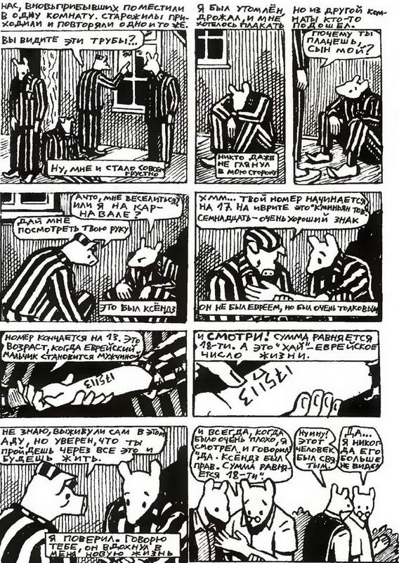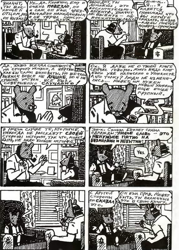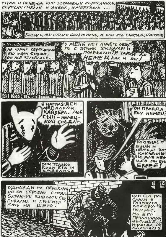 Особенность комикса Шпигельмана в том, что он посвящен... Освенциму. В эпиграфе к первому тому стоят слова Гитлера: «Евреи, безусловно, являются расой, но они не люди». В эпиграфе ко второму цитируется нацистская газета середины тридцатых, в которой достается уже самому Микки Маусу, разумеется, за «тлетворное влияние». Делаем простое уравнение и получаем шпигельмановскую ситуацию: кошки-мышки плюс все остальное.