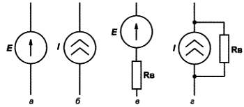 а — обозначение идеального источника напряжения, б — обозначение идеального источника тока, в — эквивалентная схема реального источника напряжения, г — эквивалентная схема реального источника тока