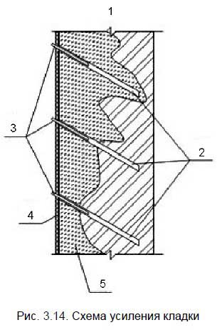 Усилить наружные участки стен (рис. 3.13) можно с помощью армированных растворных (или железобетонных) обойм с последующей инъекцией цементного раствора в кладку.