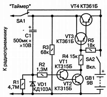 В исходном состоянии, показанном на схеме, приемник подключен к таймеру, переключатель SA1 находится в верхнем по схеме положении. При включении тумблера SA2 напряжение питания поступает к приемнику, в схеме которого имеется электролитический конденсатор фильтра. В схеме таймера все транзисторы заперты, а конденсатор С1 разряжен.