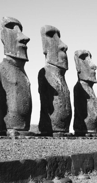 Вдоль побережья острова Пасхи возвышаются гигантские статуи из плотного вулканического туфа. Эти каменные изваяния похожи на другие изображения великанов, встречающиеся в различных регионах мира. Большинство статуй имеет высоту от 3 до 6 метров, некоторые достигают 9 метров и весят более 50 тонн. На их головы водружены огромные цилиндры из красного камня – пукао. Размеры «шляп» поражают воображение: в Пу-на-Пау обнаружен цилиндр высотой 2,5 метра и диаметром свыше 3 метров, который весит более 30 тонн. Самая большая статуя (длиной около 21 метра), так и осталась лежать в каменоломне, не доставленная к месту назначения. Массивные платформы, на которых стоят каменные идолы, достигают 60 метров в длину, их высота около 3 метров. Выр езать из камня массивные статуи, переместить их на значительное расстояние и установить на вытесанные платформы обычным людям вряд ли было под силу.