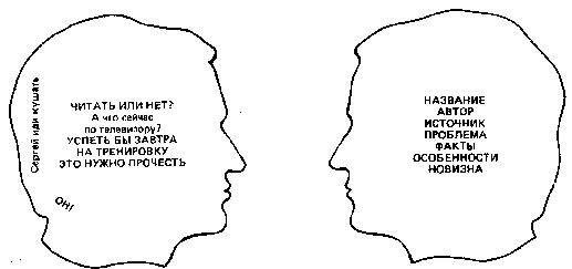 Как же создать и закрепить психологическую установку читать в соответствии с блоками интегрального алгоритма? В ее осуществлении есть два этапа: первый — осознание всех блоков алгоритма и следование им, и второй — непроизвольное, автоматическое выполнение этих действий. Как показывает опыт, эффективное решение этой двуединой задачи возможно с помощью специальных методических приемов: зрительного представления интегрального алгоритма чтения и идеомоторной тренировки. Последний методический прием взят из арсенала так называемых психотехнических игр, широко и эффективно используемых в современном спорте. Рассмотрим каждый из этих приемов отдельно.