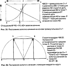 Если принять радиус кругов за 1, тогда корень квадратный из двух (√2) может быть получен из диагонали квадрата, образованного линией между двумя центрами и двумя перпендикулярными к ней радиусами. Корень квадратный из трех (√3) образуется линией, соединяющей две точки пересечения кругов весики. Корень квадратный из пяти (√5) дает диагональ прямоугольника со сторонами 2 и 1. Этот прямоугольник можно использовать для обнаружения золотой пропорции (см. рис 35, на рис. 36, 37 и 38 показаны другие способы получения золотой пропорции). Позже мы увидим, что весика и пря моугольник со сторонами 2 и 1 служили ключом к получению древних единиц измерения.