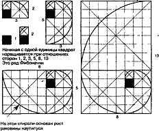 В своей книге «Священная геометрия» Роберт Лолор приводит примеры «гномонических» спиралей, подобных основанной на ряде Фибоначчи, полученной из отношения 1:2. Эти расширяющиеся схемы иногда называют «завихренными квадратами», поскольку они дают спирали, которые часто встречаются в природе (рис. 39).