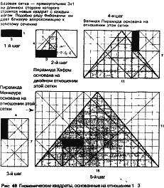 Первый квадрат образует прямоугольник с отношением сторон 3:4. При его удвоении получается отношение пирамиды Хафры — 6:4. При добавлении еще двух последовательных квадратов к прямоугольнику 3:4 получаем отношение пирамиды Хуфу — 7:11. Еще один добавленный квадрат дает пропорции пирамиды Менкаура — 11:18. Этот прием добавления квадратов к прямоугольнику 3:1 драматическим образом обнаруживает, что пирамиды отражают естественную математическую прогрессию в отношениях их высоты к основанию. Так или иначе, но они связаны гармоничным геометрическим рядом.