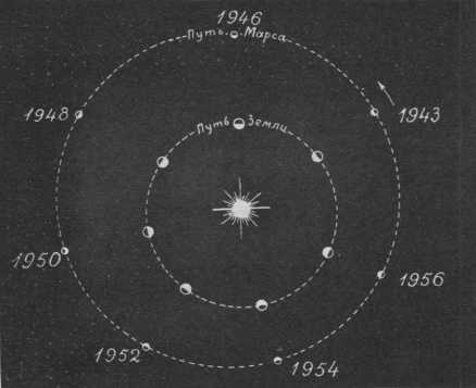 Благодаря тому что годы Марса и Земли не совпадают, расстояние этих планет друг от друга непрерывно изменяется. Будем в дальнейшем, чтобы не запутаться, вести исчисление времени в земных годах и сутках. Так вот оказывается, что через каждые два года и два месяца Марс и Земля подходят друг к другу на наименьшее расстояние. В этот момент Марс, Земля и Солнце находятся почти на одной прямой, причем Земля расположена между Солнцем и Марсом. Такое положение Марса по отношению к Земле называется противостоянием. Это — самое удобное время для его наблюдений. Марс подходит тогда к Земле в среднем на расстояние 79 миллионов километров.