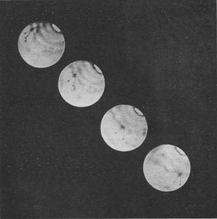 Сейчас же, продолжая наше первое знакомство с Марсом, мы обратим внимание на те детали, которые наблюдаются на его поверхности. В отличие от поверхностей больших планет и Венеры, поверхность Марса имеет устойчивые и постоянно наблюдаемые детали. Прежде всего обращают на себя внимание темные зеленовато-синеватые пятна, выделяющиеся на общем оранжевом фоне остальной поверхности Марса. Эти пятна имеют вполне определенные и постоянные очертания. Наблюдая за ними в течение ночи, можно обнаружить, что они все время смещаются по отношению к краю диска Марса. Появляясь на одном его краю, они постепенно приближаются к середине диска, а затем, продолжая свое движение, скрываются за противоположным краем. Объяснить наблюдаемое весьма легко: Марс, как и Земля, вращается вокруг своей оси.