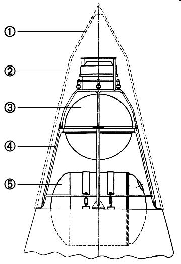 Схема размещения аппаратуры на Втором спутнике: 1 — сбрасываемый защитный конус; 2 — прибор для регистрации УФ и рентгеновского излучения Солнца; 3 — сферический контейнер с радиопередатчиками; 4 — силовая рама; 5 — гермокабина с подопытным животным