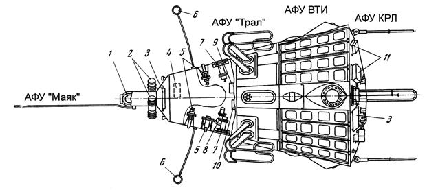 Научная аппаратура Третьего спутника: 1 — магнитометр; 2 — фотоумножители для регистрации корпускулярного излучения Солнца; 3 — солнечные батареи; 4 — прибор для регистрации фотонов в космических лучах; 5 — магнитный и ионизационный манометры; 6 — ионные ловушки; 7 — электростатические флюксметры; 8 — масс-спектрометр; 9 — прибор для регистрации тяжелых ядер в космических лучах; 10 — прибор для измерения интенсивности первичного космического излучения; 11 — датчики для регистрации микрометеоров