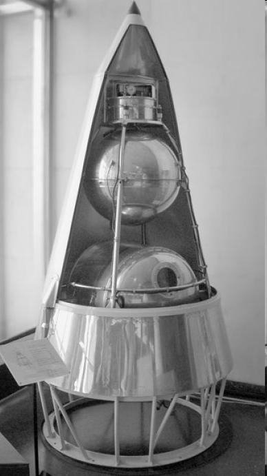 Модульная конструкция Второго спутника: приборный блок (СП-65) — блок передатчиков (аналог Первого ИСЗ) — кабина Лайки — блок телеметрической аппаратуры (единый для РН и ИСЗ) — последняя (неотделяемая) ступень ракеты-носителя. В корпусе РН дополнительно размещались два прибора для регистрации космических лучей, программно-временное устройство и источники электропитания (Фото И.Афанасьева)