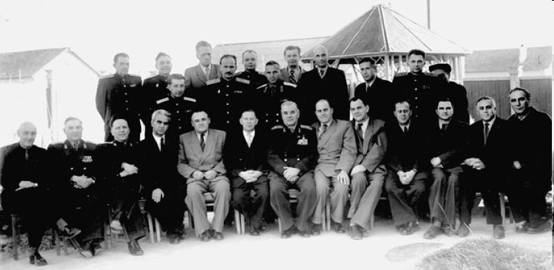 Госкомиссия по испытаниям ракеты Р-7 и первого спутника, а также руководители испытаний. Площадка 10 полигона Тюратам, осень 1957 г. Слева направо сидят: Г.Р.Ударов, А.И.Семёнов, А.Г.Мрыкин, М.В. Келдыш, С.П.Королёв, В.М.Рябиков, М.И. Неделин, Г.Н. Пашков, М.С. Рязанский, К.Н.Руднев, В.П.Глушко, В.П.Бармин, В.И.Кузнецов; стоят: П.Е.Трубачёв, Г.А. Тюлин, Н.Н.Смирницкий, Н.А.Пилюгин, А.А.Васильев, В.И.Ильюшенко, А.И. Носов, А.Ф. Богомолов, К.Д. Бушуев, В.И.Курбатов, К.В.Герчик