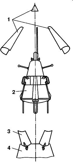 Проектная схема отделения спутника «объект Д» от ракеты-носителя: 1 — носовые створки обтекателя; 2 — спутник; 3 — хвостовые щитки обтекателя; 4 — последняя ступень РН