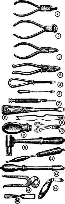 Рис. 67. Набор электромонтажных и слесарных инструментов: 1 — круглогубцы; 2 — кусачки; 3 — плоскогубцы; 4 — пассатижи; 5 — мелкомонтажная отвертка; 6 — электромонтажная отвертка; 7 — универсальная часовая отвертка; 8 — отвертка для слесарных работ; 9 — отвертка для столярных работ: 10— ножницы по металлу; 11 — молоточный электропаяльник; 12 — торцовый маломощный электропаяльник; 18—торцовый электропаяльник на 80—100 ватт; 14 — клещи; 15 — перочинный нож;16 — стамеска.