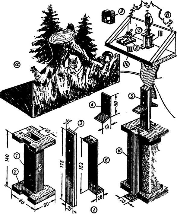 Изготовление аттракциона начинайте с соленоидного реле охраны лисы по рисунку 59, г. Склейте каркас 1 катушки со щечками 2 из 3-миллиметровой фанеры, просушите его и намотайте 300–400 витков провода диаметром от 0,6 до 1 миллиметра. Прикрепите катушку к деревянному основанию 10. Для сердечника нарежьте полосок из кровельного железа или жести по выкройке 3. Сложите их вместе и просверлите нужное количество отверстий. Толщина набора должна быть 6–8 миллиметров. Из упругой листовой латуни сделайте два контактных упора 4 по указанной форме и размерам. Вырежьте из фанеры силуэт лисы и прикрепите его вместе с контактными упорами к верхнему концу сердечника 5, как показано на рисунке 59, г. Скрепите сердечник заклепками. Сделайте две одинаковые контактные стойки 6 из толстой медной или латунной пластинки. Вставьте сердечник в полость катушки выступом с лисой вверх. Прикрепите контактные стойки к основанию с противоположных боков катушки так, чтобы сердечник с силуэтом лисы свободно перемещался вверх и вниз без заеданий и перекосов.