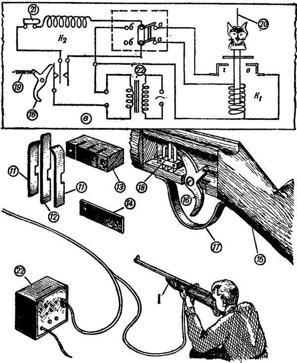 Винтовку включите в цепь длинными изолированными проводами или шнуром. Питание для аттракциона следует брать от понижающего трансформатора 22, дающего напряжение 48–50 вольт, или от аккумуляторных батарей на 12–24 вольта. После сборки аттракциона проверьте еще раз правильность всех его цепей и приступайте к пробным испытаниям.