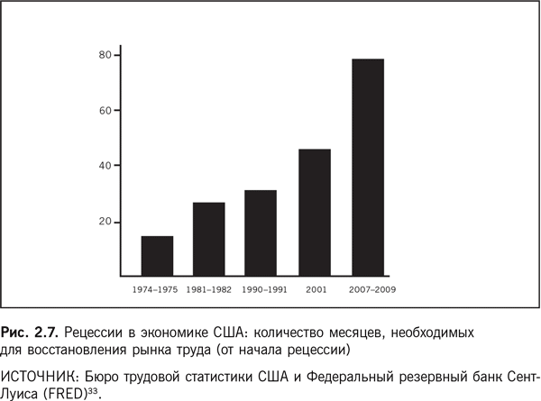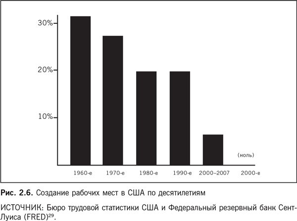 С каждым новым десятилетием в течение последних пятидесяти лет экономика США все хуже и хуже справляется с задачей создания новых рабочих мест. Лишь в 1990-е гг. американцам удалось — да и то не в полной мере — удержать тот же темп роста количества рабочих мест, что и в предшествующем десятилетии, во многом благодаря технологическому буму во второй половине десятилетия. Начавшаяся в декабре 2007 г. рецессия и последовавший за ней финансовый кризис поставили крест на планах создания достаточного количества новых рабочих мест в 2000-е гг.: к концу десятилетия в экономике было практически столько же рабочих мест, сколько в 1999 г. Впрочем, еще до наступления мирового экономического кризиса первое десятилетие нового столетия уже имело все шансы стать худшим по показателю роста занятости со времен Второй мировой войны.