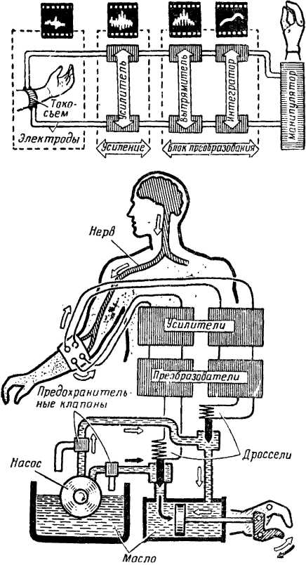 На рис. 4 (вверху) показана блок-схема биоэлектрического управления. Она включает токосъем, усилитель, преобразователи, исполнительный орган (манипулятор). Преобразователь предназначен для того, чтобы определить, какое движение намерен выполнить оператор, и дать соответствующий импульс манипулятору. На рис. 4 (внизу) показана схема гидроэлектрического привода искусственной руки биоточного манипулятора.