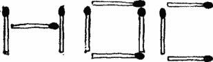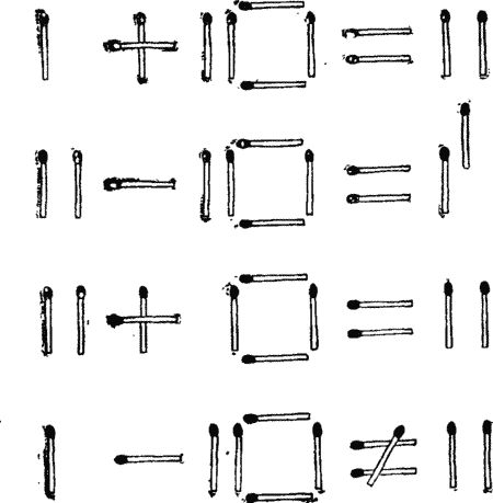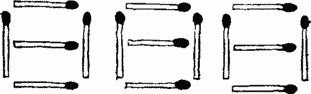 Если две предыдущие головоломки со спичками покажутся вашим друзьям слишком легкими, предложите им следующий, более трудный вариант. Спички разложены так же, как и прежде. Требуется взять 13 спичек так, чтобы осталось 8. На этот раз нужно догадаться, что из спичек можно сложить арифметическое выражение, значение которого равно 8.