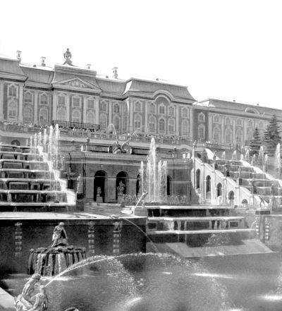 От берега моря до самого дворца был прорыт канал, море как бы подступало к дворцу, еще не законченному, но уже горделиво высившемуся на краю обрыва. Еще ни одна резиденция в мире не имела такого въезда. Не достроены были и каменные лестницы, которые спускались уступами в парк, где садовники распоряжались посадкой привезенных из-за границы цветов, а фонтанные мастера наблюдали за прокладкой деревянных труб.