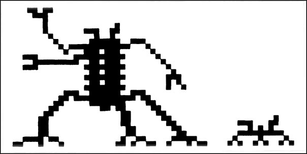 Инопланетяне. Так я называл те 1711 бит третьей страницы послания. В каком–то смысле расшифровать её было гораздо легче, чем вторую — две строки нулей и единиц, что описывали планетарную систему Лисички. В конце концов, третья страница содержала картинку, и картинка эта действительно, по–видимому, изображала инопланетную форму жизни. Конечно, я не был уверен, что данный набор пикселей изображает именно их, но два объекта походили на существ больше, чем на что–либо ещё, что я мог себе представить. Один из инопланетян был высокий и долговязый; второй, крошечный по сравнению с первым, гораздо более приземистый и компактный. Я назвал их Треногий иЩенок.