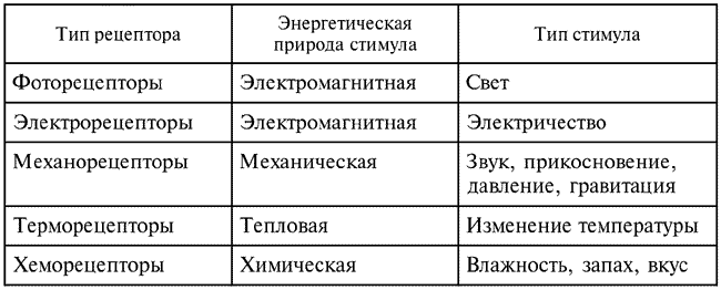 Таблица 4. Типы рецепторов и воспринимаемые ими стимулы.