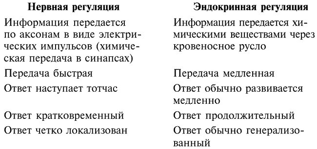 Помимо нервной системы деятельность организма координирует эндокринная система. Она передает сигналы с помощью веществ, переносимых кровью, и реагирует образованием какого-либо вещества, например слез при попадании в глаз частичек пыли. Эти вещества выделяются так называемыми железами. Эндокринные железы секретируют гормоны — специальные химические соединения, которые поступают в кровяное русло и доставляются к удаленным органам, тканям или группам клеток, где проявляют свое регулирующее действие. Различия между нервной и эндокринной регуляцией (по Н. Грину, У. Стауту, Д. Тейлору) представлены ниже.