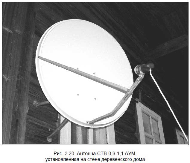 Такой выбор я предлагаю потому, что эту же тарелку можно потом применить для НТВ+ и «Триколора» — если пользователь решит, что пора увеличивать количество платных каналов, в том числе русскоязычных. Такая антенна СТВ-0,9–1,1 АУМ (рис. 3.20), предназначенная для приема сигналов с геостационарных спутников в Ku диапазоне, универсально подойдет для всех рассмотренных задач. Единственно что — она не предназначена для передачи сигнала на спутник и требует для этого специальной доработки в заводских условиях.