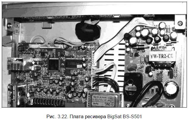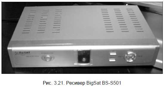 После выбора тарелки вторым важным вопросом является выбор ресивера — устройства, демодулирующего принятый антенной спутниковый сигнал. Наиболее популярные сегодня модели по соотношению «цена-качество»: BigSat BS-S501 Xtra (рис. 3.21 и 3.22) и Euston 5000PVR. Эти ресиверы не имеют декодировщика и могут принимать и обрабатывать сигнал только со «свободных» программ, бесплатных и условно-бесплатных (без абонентской годовой карты). Для приема групп спутников НТВ+, «Триколор» или аналогичных ресивер потребуется заменить (цена вопроса — пара тысяч рублей). Облучатели антенны (конвертер, головка) — например, Echostar BS-150A или Euston U3 — универсальные. Главное, чтобы антенна была рассчитана на прием сигналов Ku диапазона, то есть 10,7-12,75 ГГц.