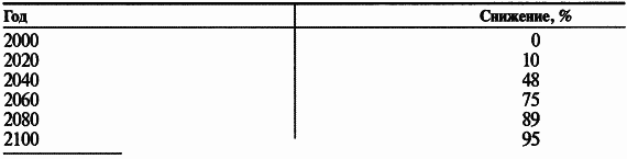 Если лабораторные технологии могут ежегодно повышать эффективность на 4 %, а затем внедряться в мировое производство со средним запаздыванием в 20 лет, то выбросы загрязнений в окружающую среду можно быстро уменьшить. В таблице приводятся проценты снижения выбросов, достигнутые в модели World3 в Сценарии 3 после того, как моделируемое население в расчетном 2002 г. пытается уменьшить загрязнение с максимально возможной скоростью, какую только может обеспечить технический прогресс.