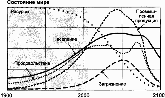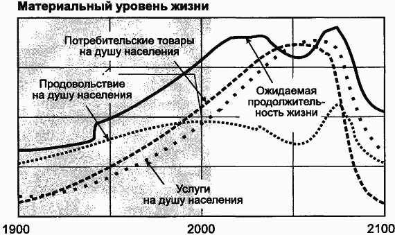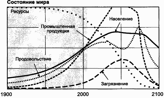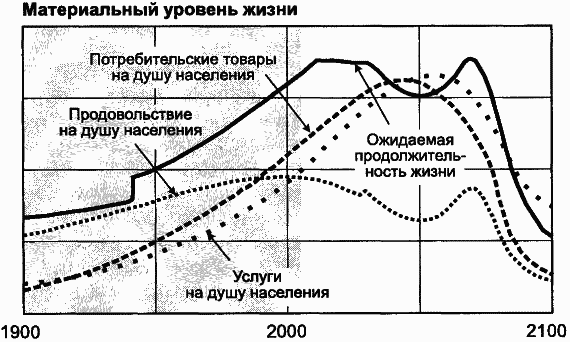 капитала (амортизация), чтобы направить их в сельское хозяйство и на уменьшение загрязнения окружающей среды. Экономика приходит в упадок еще и из-за нарастающего истощения невозобновимых ресурсов в конце столетия, и в итоге наступает коллапс.