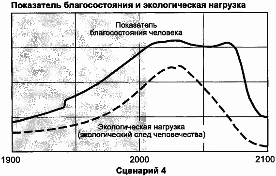 В этом сценарии загрязнение нарастает примерно 50 лет, несмотря на специальную программу борьбы с ним, поскольку влияют запаздывание внедрения и продолжающийся рост промышленного производства. Однако степень загрязнения все-таки существенно ниже, чем в Сценарии 2. Оно никогда не достигает уровня, не наносящего вреда здоровью людей, и за счет этого «антизагрязнительного» эффекта эпоха большой численности населения и высокого уровня материального благосостояния продлевается на одно поколение. Хорошие времена заканчиваются в 2080-х гг. — сорока годами позже, чем в Сценарии 2, как показывает показатель благосостояния человека, резко снижающийся в этот период. Загрязнение успевает негативно подействовать на урожайность несколько раньше. Она не снижается сразу же, поскольку уменьшение продуктивности земель частично компенсируется за счет направления в сельское хозяйство дополнительных потоков. В «реальном мире» примером такого явления может служить применение извести для нейтрализации последствий кислотных дождей, использование удобрений для восполнения питательных веществ в почве (обычно их создают почвенные микроорганизмы, но они страдают из-за применения пестицидов), а также организация орошения, чтобы компенсировать недостаток осадков, вызванный изменением климата.