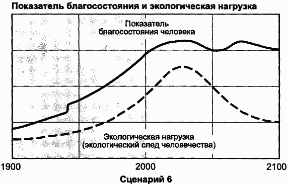 Такое мощное сочетание технологий позволяет избежать катастрофы, которая в Сценарии 5 наступила в последней трети XXI в. Однако все эти технологии дают желаемый результат слишком поздно, и это не позволяет избежать постепенного снижения показателя благосостояния человека в последней трети XXI в. Численность населения уменьшается незначительно, но около 2050 г. временно наблюдается довольно серьезное уменьшение ожидаемой продолжительности жизни. Одновременно -