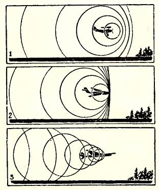 При полете самолета со скоростью меньше звуковой звуковые волны обгоняют самолет (рис. 1). Если скорость полета равна звуковой, звуковые волны образуют перед носом самолета так называемый звуковой барьер (уплотнение воздуха), движущийся вместе с самолетом (рис. 2). Новые реактивные самолеты, которые в июне, готовясь к воздушному параду, летали около Москвы, движутся со скоростями, значительно превосходящими скорость звука. На такой скорости звуковые волны отстают от самолета и, складываясь друг с другом, создают мощную коническую волну (рис. 3).