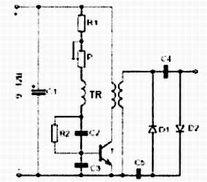 Блокинг-генератор выполнен на транзисторе Т и высоковольтном трансформаторе TR. Умножитель напряжения состоит из элементов схемы D1, D2 и С4, С5. Сопротивление R2 служит для ограничения до 200 мкА тока короткого замыкания.