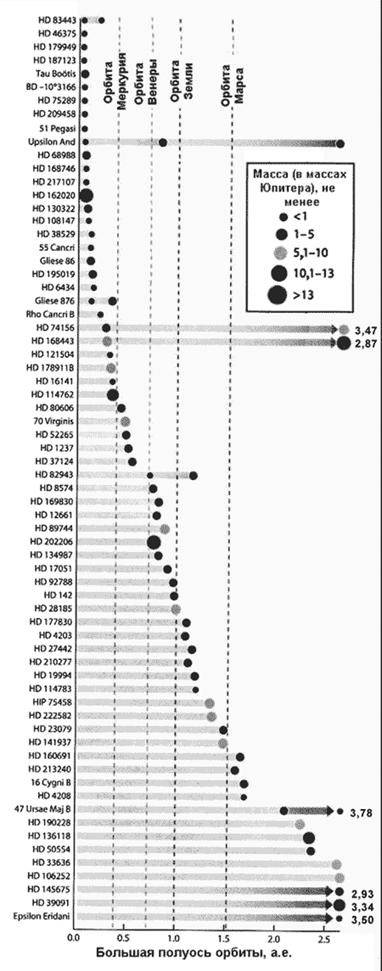 Распределение орбит внесолнечных планет и минимальные оценки их масс. Положение планет в кратных системах за пределами поля рисунка показано значением большой полуоси орбиты (например, вторая планета системы HD 74156 имеет большую полуось орбиты 3,47 а.е.). (Из работы Кестлер, 2003 г.)