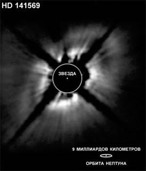 Объект HD 141569. Центральная часть снимка закрыта, но края зоны хорошо видны. (Снимок Б. Смита и его коллег, наблюдения на HST, 1999 г.). Наблюдения газово-пылевых дисков неизменно показывают окружающую звезду обширную центральную зону, свободную от пыли и газа.