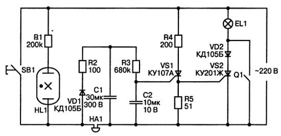 При нажатии посетителем кнопки SB1 переменное напряжение электросети 220 В оказывается приложено к звонку НА1, и он начинает звонить. При этом почти мгновенно заряжается конденсатор С1. Постоянная времени его заряда составляет всего 3 мс, так что за 10 мс он зарядится полностью, а посетитель даже не успеет снять палец с кнопки. Заряжается также и конденсатор С2, что приводит к отпиранию тиристора VS1, а падением напряжения на резисторе R5 отпирается тиристор VS2, благодаря чему зажигается вполнакала лампа EL1 в прихожей. Лампа продолжает гореть и когда посетитель отпустит кнопку, так как конденсатор С2 будет подзаряжаться от конденсатора С1 накопленным в нем количеством электричества. Поэтому после нажатия звонковой кнопки свет в прихожей может гореть примерно 30–40 с. Этого времени вполне достаточно, чтобы хозяин прошел в прихожую и с помощью выключателя Q1 зажег лампу в полный накал.
