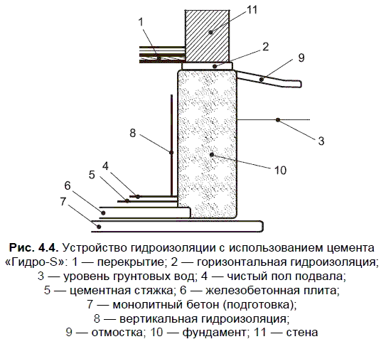 Второй — вариант с использованием цемента Гидро-S — приведен на рис. 4.4. В основании пола подвала устраивается бетонная подготовка из бетона марки не ниже 100 толщиной 100 мм. На ней выполняется монолитная железобетонная плита на цементе Гидро-S. Далее по стенам и полу подвала укладывается слой цементного раствора толщиной 30 мм также на цементе Гидро-S.